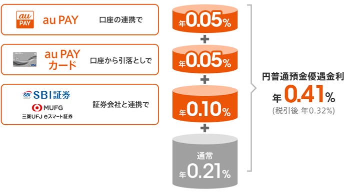 au Pay、三菱UFJ eスマート証券/SBI証券などの連携やプレミアムステージで高水準の普通預金金利