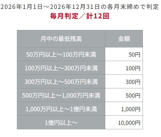 | 前月末預金残高 | 100万円以上 | 300万円以上 | 500万円以上 |